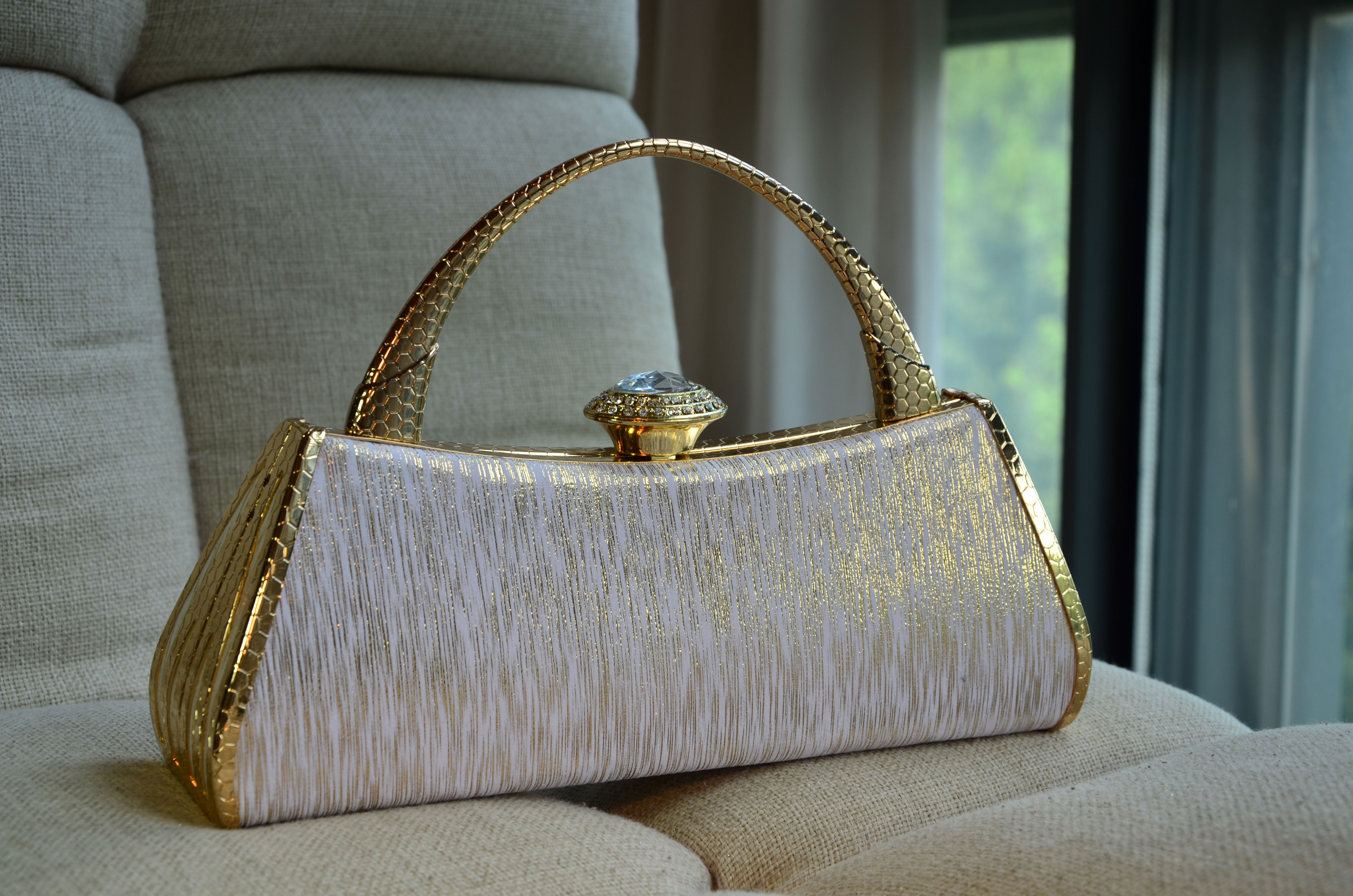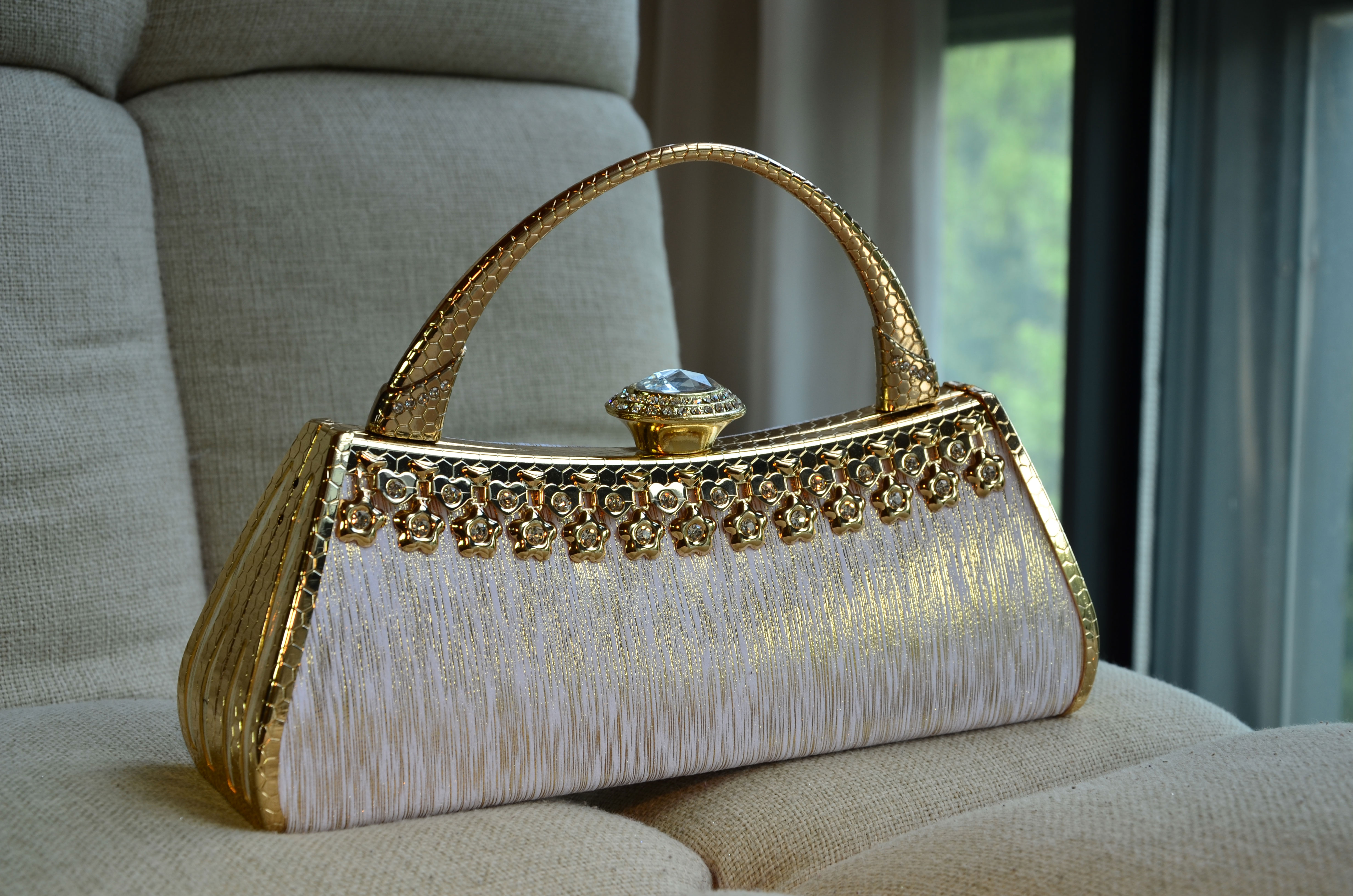 4. Color: Classic gold, designed for use during special occasions with formal clothing. The bag has a unique Button Shape,2 Laps little rhinestone surround a super big one,which just like a Big Diamond.