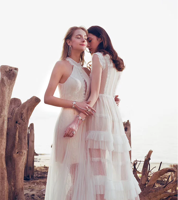 White lace cross collar holiday skirt translucent yarn sexy evening dress
