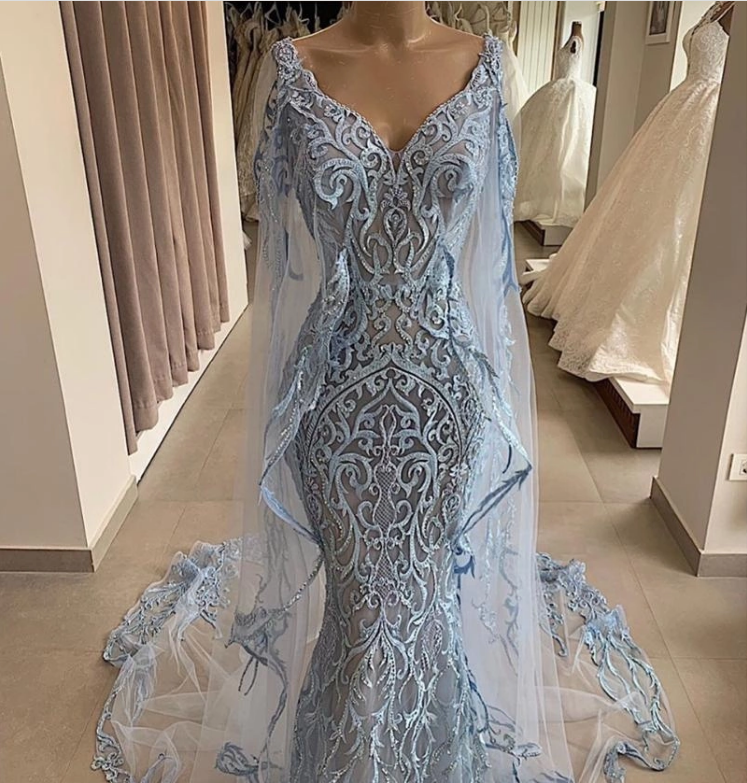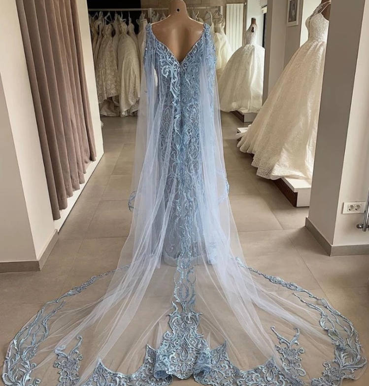 New Blue Lace Applique Mermaid Tulle with Long Cape Evening Dress