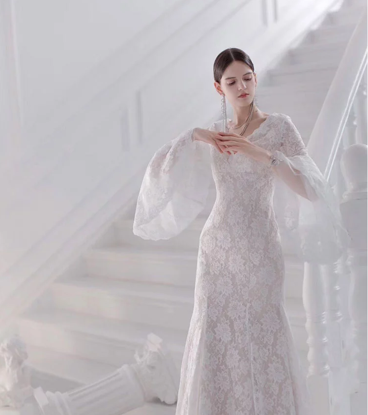 Elegant White v-neck flared sleeve backless lace sexy evening dress