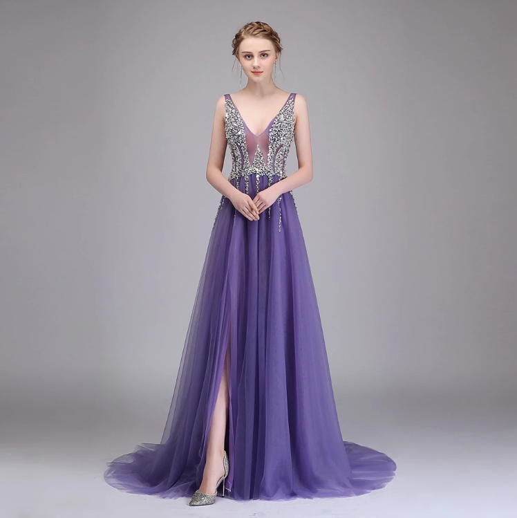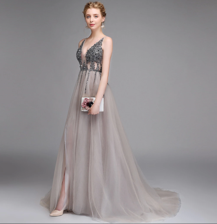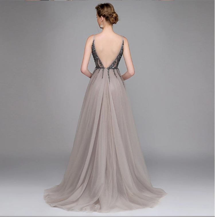 Sexy Long Deep V-neck Party Gown Backless Beads Crystal Prom Dresses Evening dress