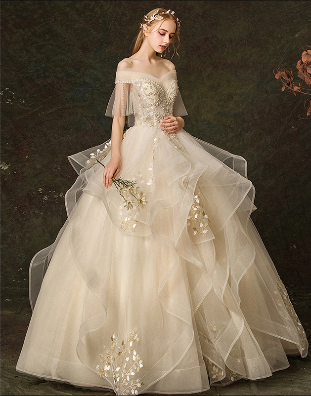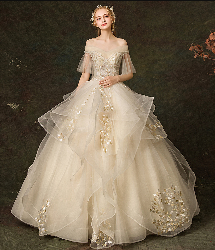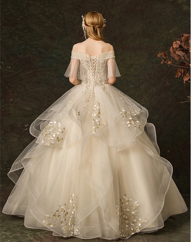 Champagne Romantic Off Shoulder Lace Wedding Dress Vintage Woman Ball Gown