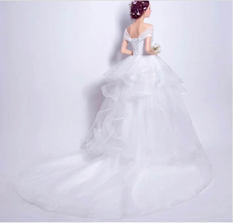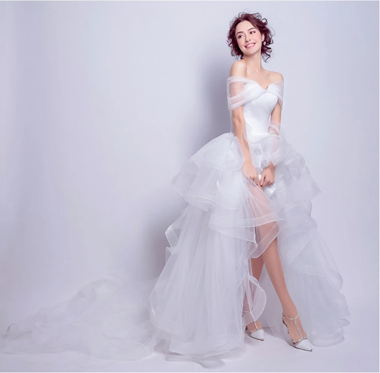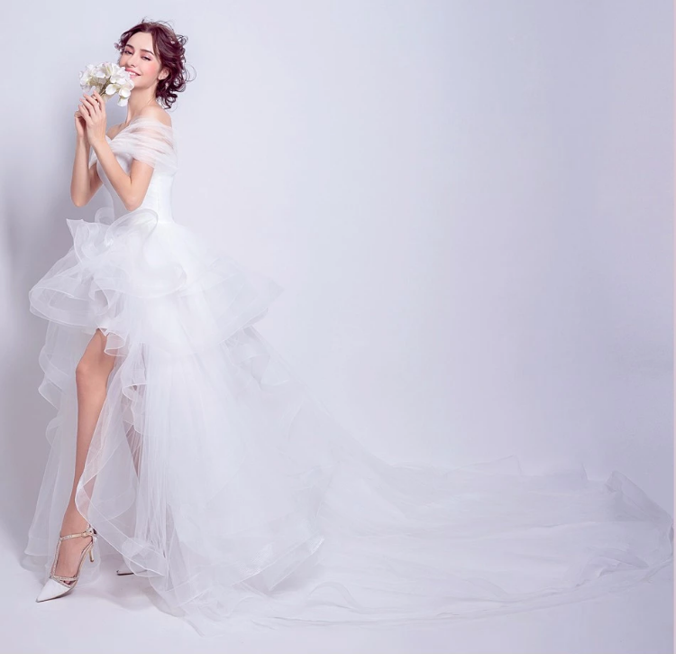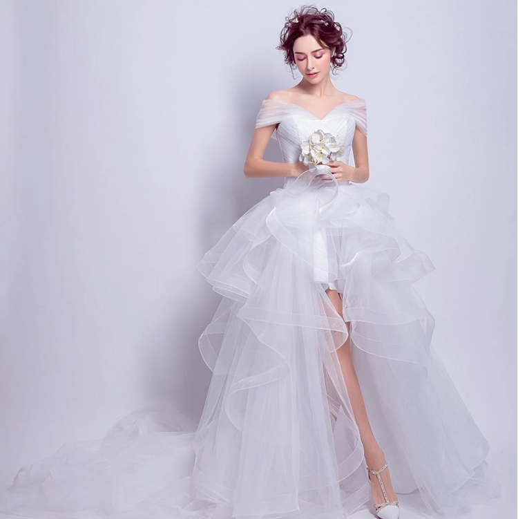flat off shoulder short front long back plain pure white wedding dress fluffy gown