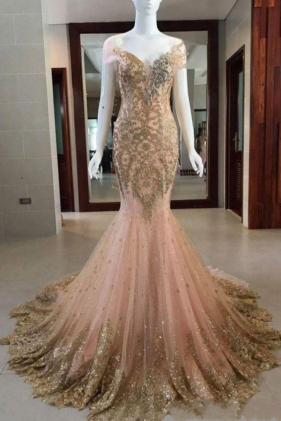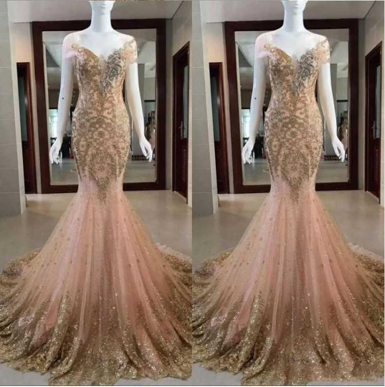 Lace Sheer Neck Illusion Peach Mermaid Prom Evening Dresses Lace Appliques bling bling Crystal Formal party Gowns