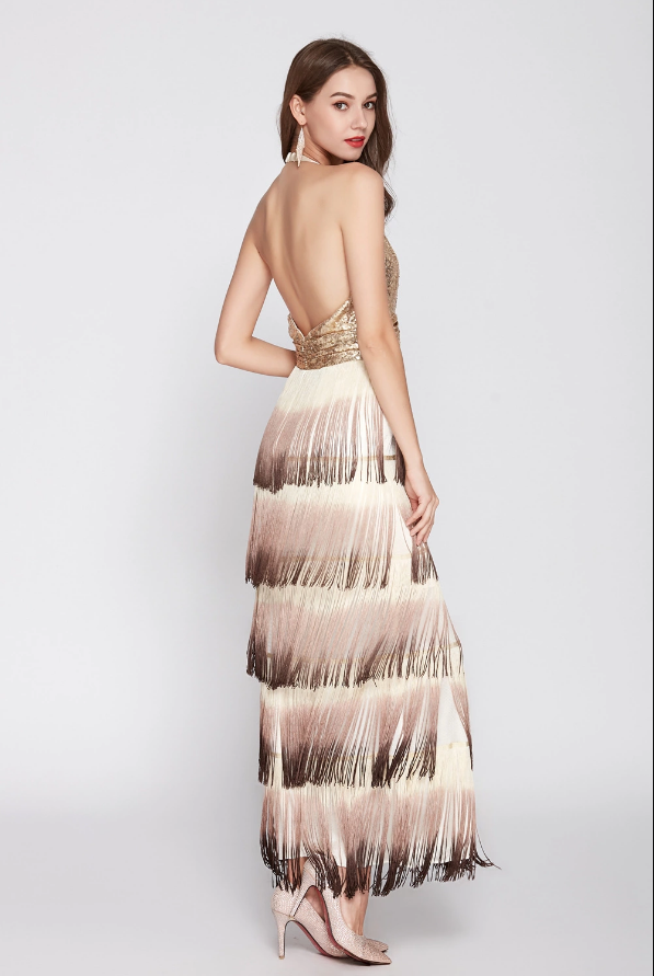 chic women evening dress with sequnies tassels design formal full dress halter for dinner party off shoulder