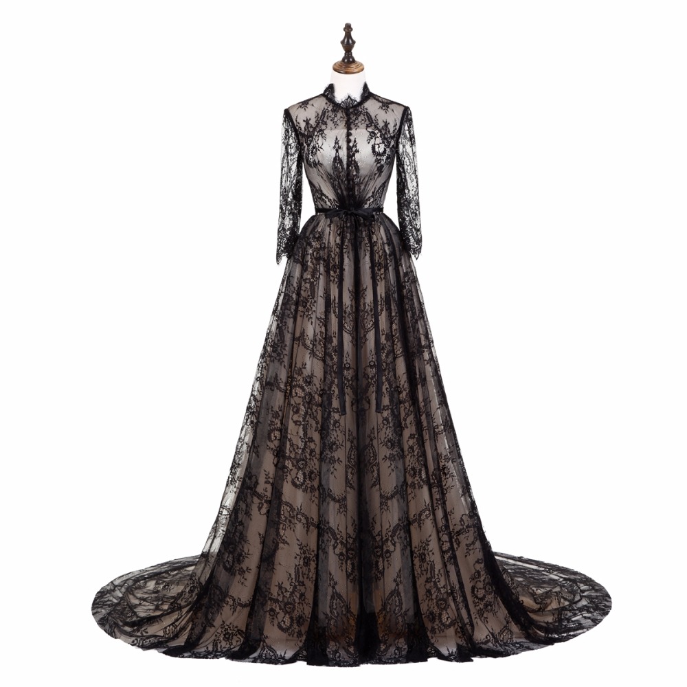 Elegant Black Champagne Evening Dresses Lace Muslim Long Sleeves High Neck Prom Gowns Long Dresses 2019