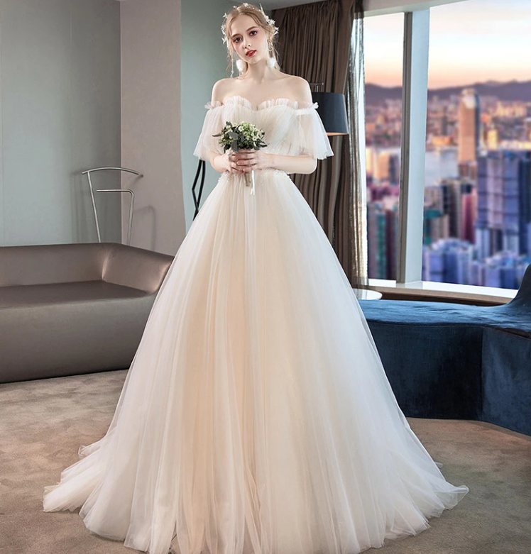 Lace wedding dress bride new word shoulder trailing white simple slim princess super fairy French court