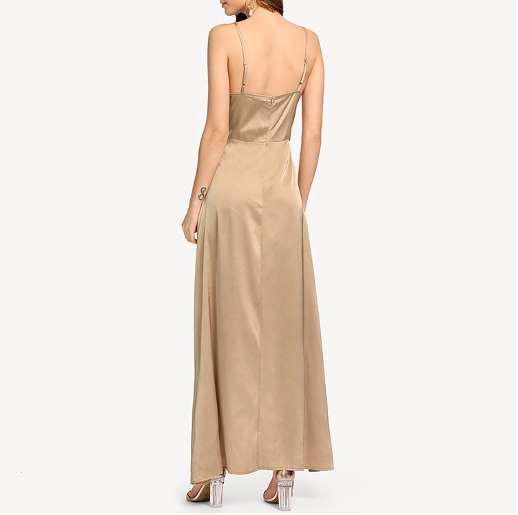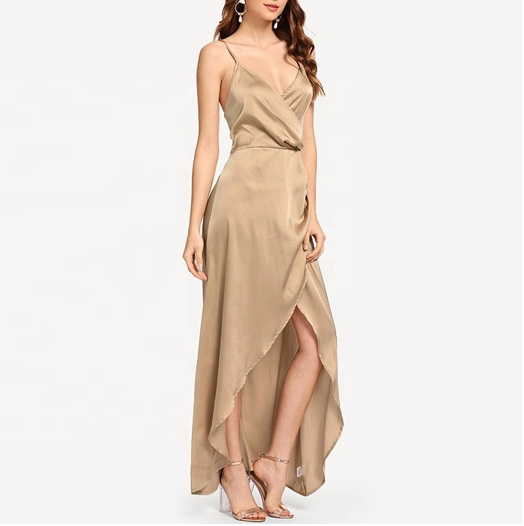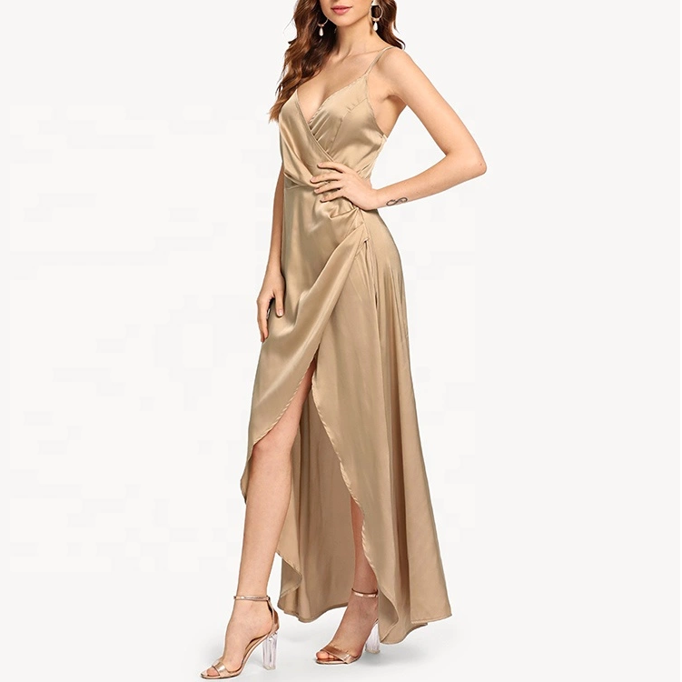 Women Party Solid V Neck High Waist Maxi Length Wrap Satin Sexy Dress