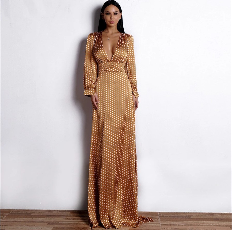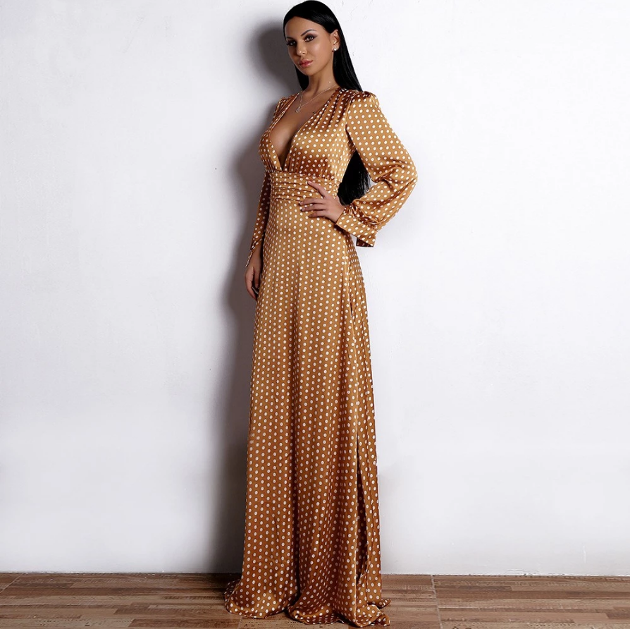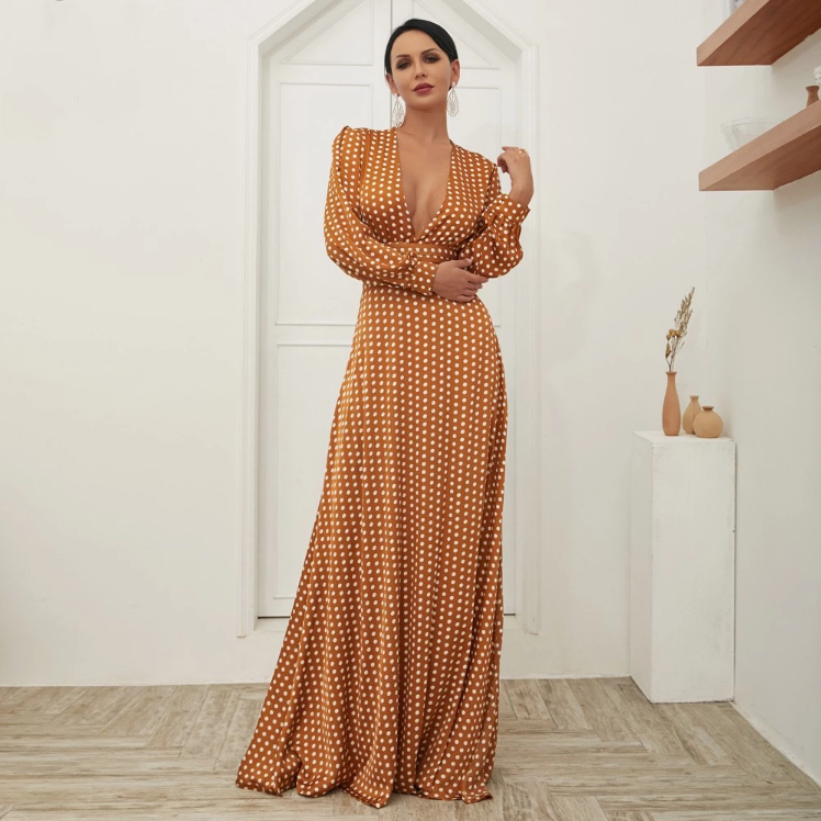 women elegant wave point long dress sexy v-neck bohemian style casual dress