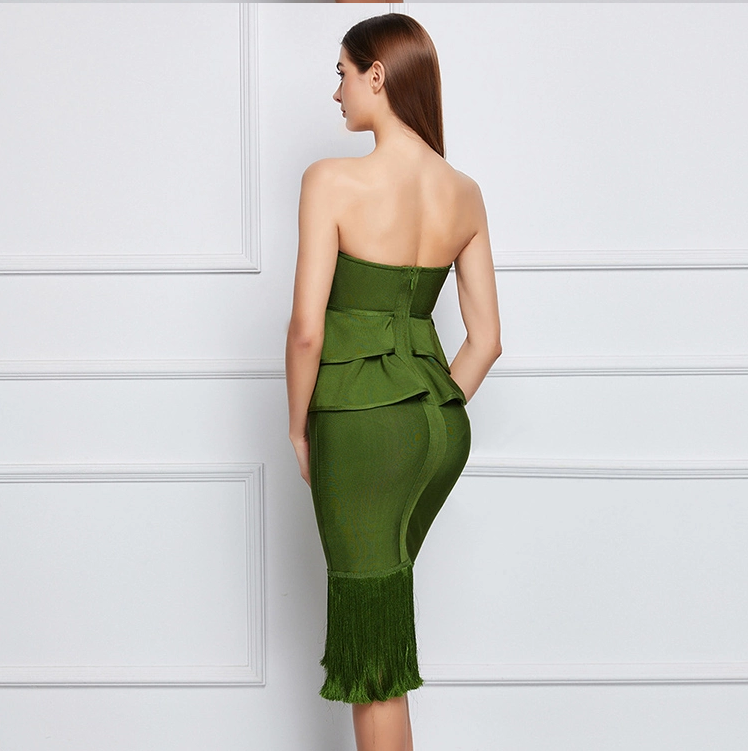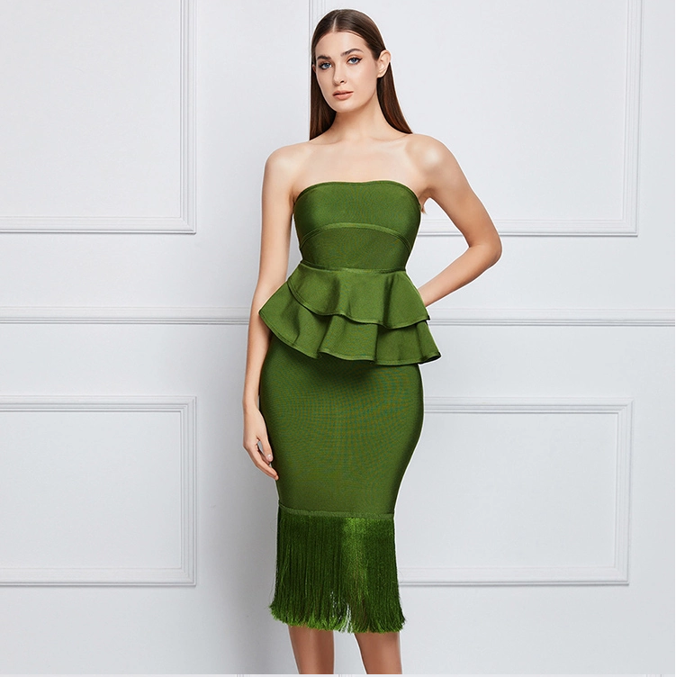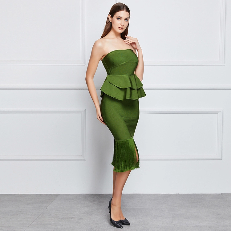 Fashion Waist Ruffle Design Below Knee Tassel Women Mini Bodycon Bandage Party Dress