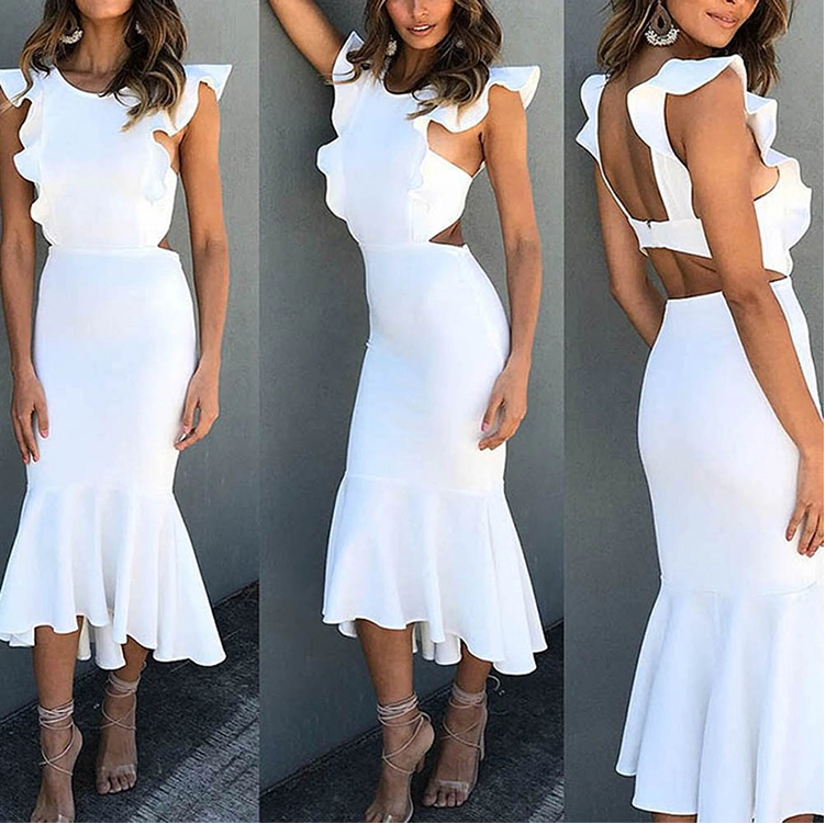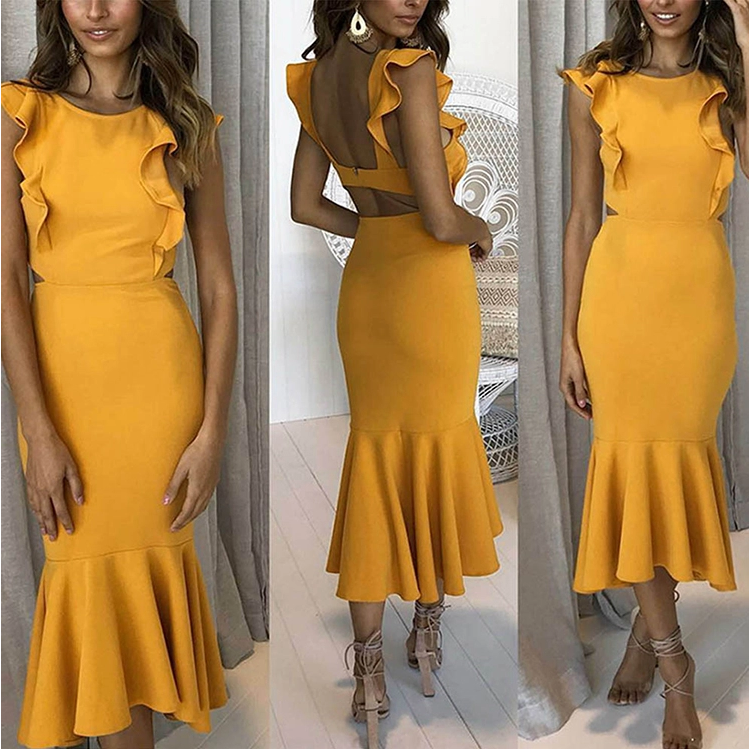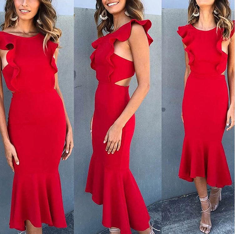 Sleeve Ruffle Shoulder Women Fashion Bodycon Mermaid Evening Party Midi Dress